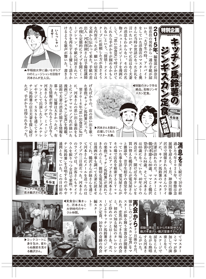 | 昨日(9/27)少年画報社からムック本『思い出食堂』最新刊(通巻84号)が届きました。 今年4月のライブで「キッチン馬鈴薯」のマスター&ママさんと40年ぶりに奇跡の再会を果たし、さらに6月にはジンギスカン定食実食会を開催したことなどをまんがにしてもらった“キッチン馬鈴薯のジンギスカン定食<再会編>”が掲載された号です。 |