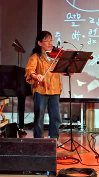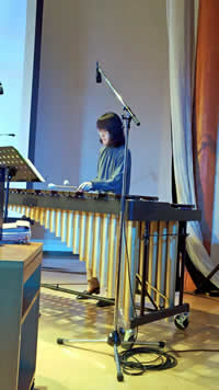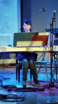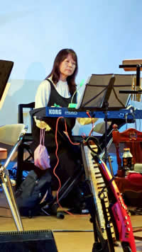 | 頼りになる女性陣。左からバイオリン・仁多理恵、シンセサイザー・小貫ますみ、ピアノ・河本充代、マリンバ・岩岡美希 | |