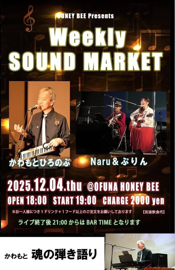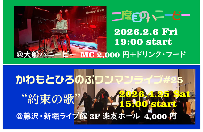 で、12月4日に初めて出演させてもらった大船ハニービーから2月6日(金)もいかがですかというオファーをいただいたので、オリジナル曲はもちろんやるにしても、思い切って数曲はカバーをやろうかと。 詳細は後日またご報告させていただきます。 ◆2026.2.6 金19:00〜@大船ハニービー ◆2026.4.25 土15:00〜@藤沢・新堀ライブ館 是非、ご期待くださいませ(^^)/ |
