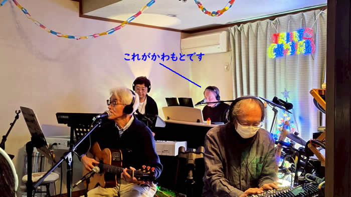 | 左から今回ゲスト奏者として出演の矢口一朗さん、ギター・和田正昭、カホン&コーラス・岩佐敏哉、かわもと | |