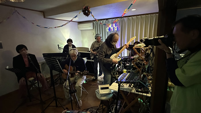 柴庵というのは、柴犬が異様に好きな“かわもとファンクラブ会長”の為本雄司くんが、実家を音楽用に改装したもの。 そこで毎年暮れに「柴庵ライブ」と称して、大学時代をともに“抒情フォーク研究会”というサークルで過ごした仲間たちがワイワイやりながらひと時を過ごすという催しが行われます。 もはや、自分にとって早稲田大学に在籍していたことを証明する唯一の手段とも言えます(笑) 一応、音楽サークルなので、歌う人、楽器を弾く人、聴く人、機材のコントロールをする人、様々います。 そして、出演者・聴衆全員がヘッドフォンをつけて参加するという一風変わったものです。 |