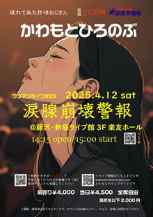 かわもとひろのぶワンマンライブ#13, #14, #15は新型コロナウィルスの影響で中止となりました。 #16が開催出来たことに感謝申し上げます。 |