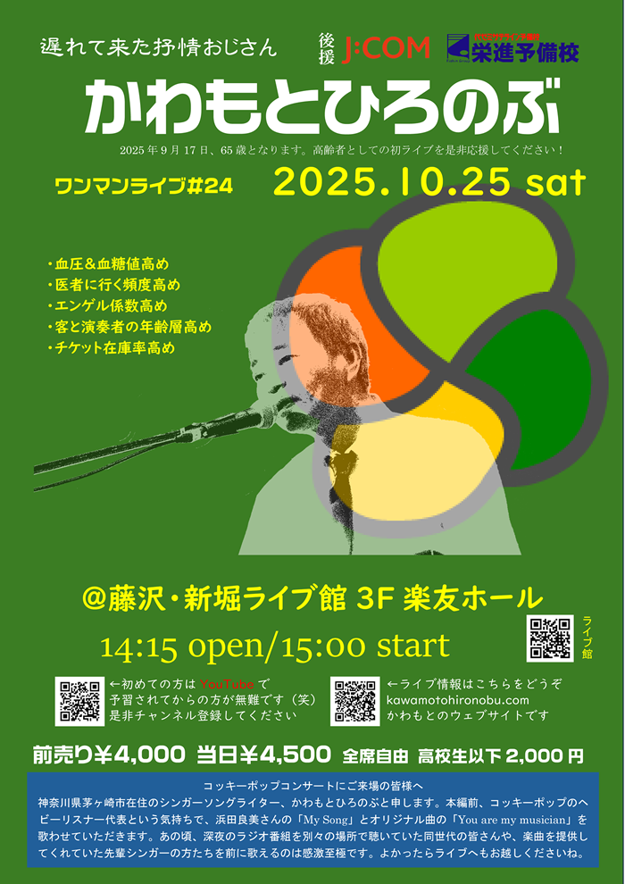 さて、そんなかわもとさんが来月25日、かつてふじさわびと編集部があった新堀ライブ館でコンサートを行います。今回のコッキーポップコンサート出演の、まさに凱旋公演。 お近くの方、ポプコン世代の方、ぜひ足をお運びください(^^♪ WEBふじさわびとの告知記事はこちらです |