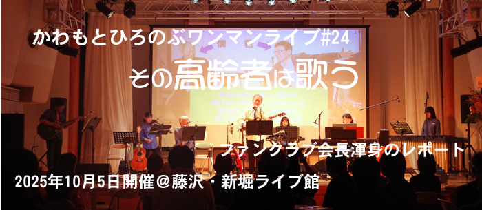 | 今日の湘南藤沢は最高気温15℃、小雨。 少し肌寒さも感じる中、会場の新堀ライブ館楽友ホールへ。 かわもとひろのぶ ワンマンライブ#24 すっかり春秋の恒例行事になったワンマンライブ 今年の桜はどうだったとか、夏の暑さはどうだったとか、、 新型コロナ蔓延で身動きが取れなかった頃のことを思えばやっと日常を取り戻せた感も。 |